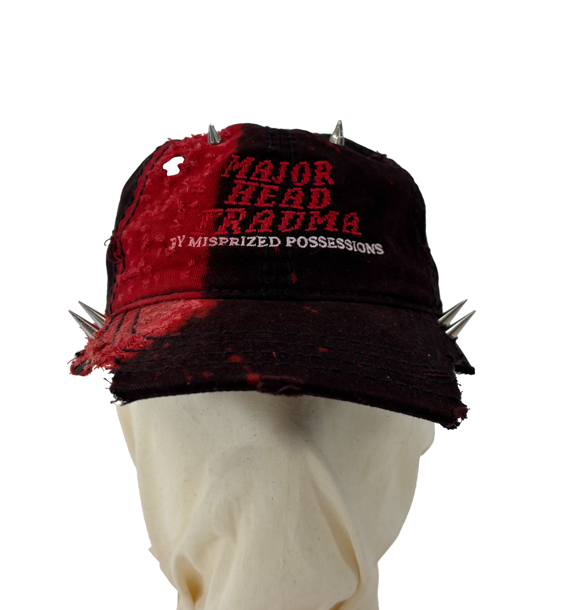 Black Hat with embroidered design, custom Bloody dye, spikes and custom distressing