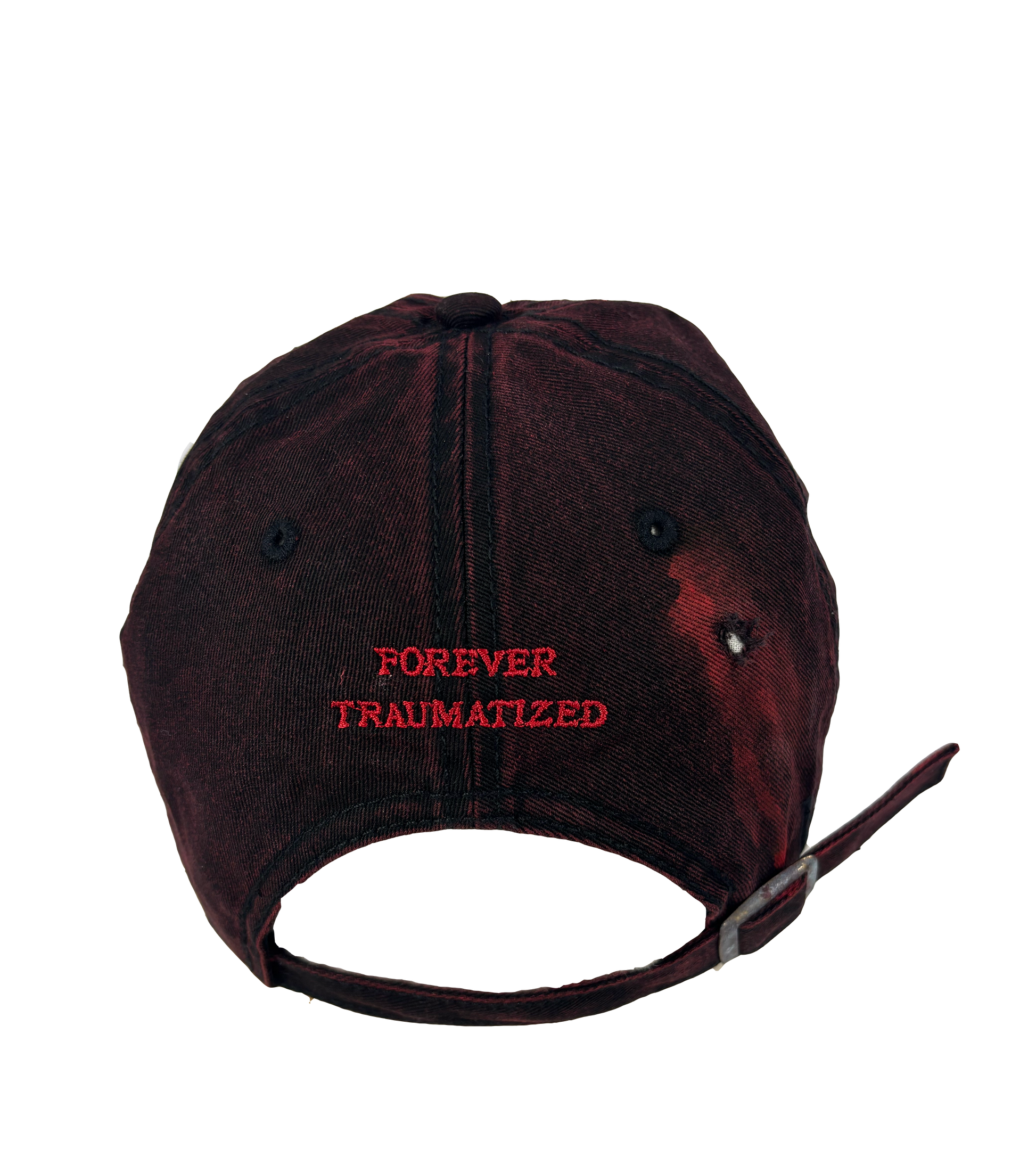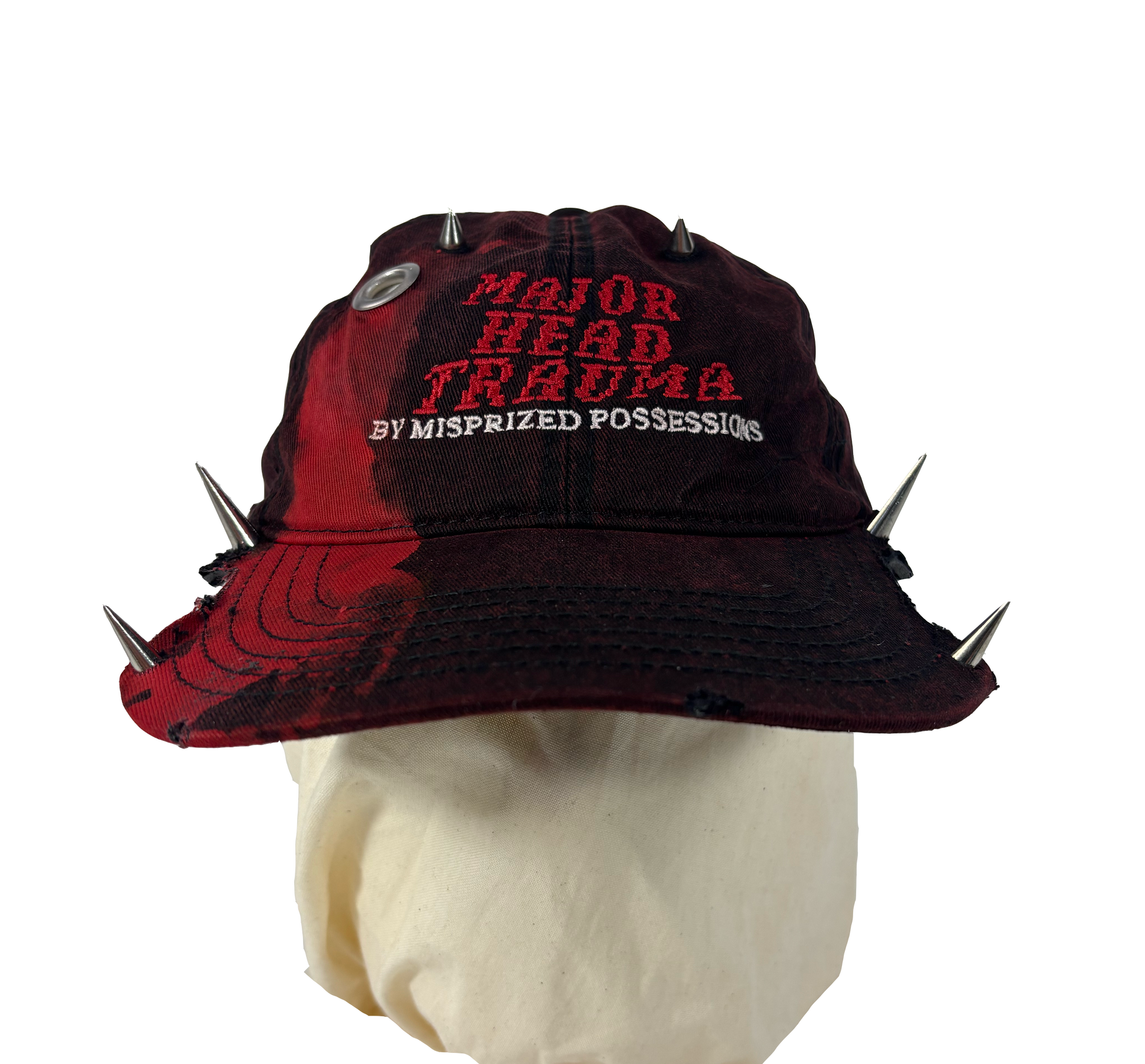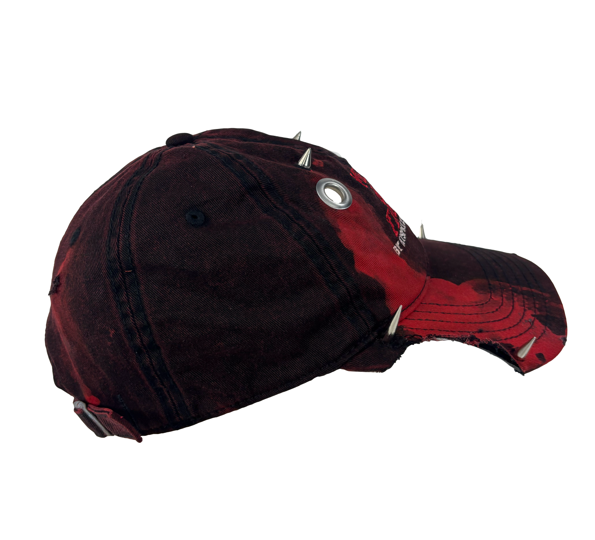 Burgundy-colored denim hat with embroidered design, custom bloody dye effect, custom details spikes and studs