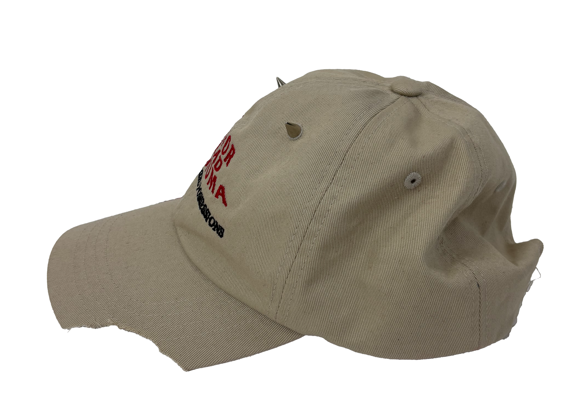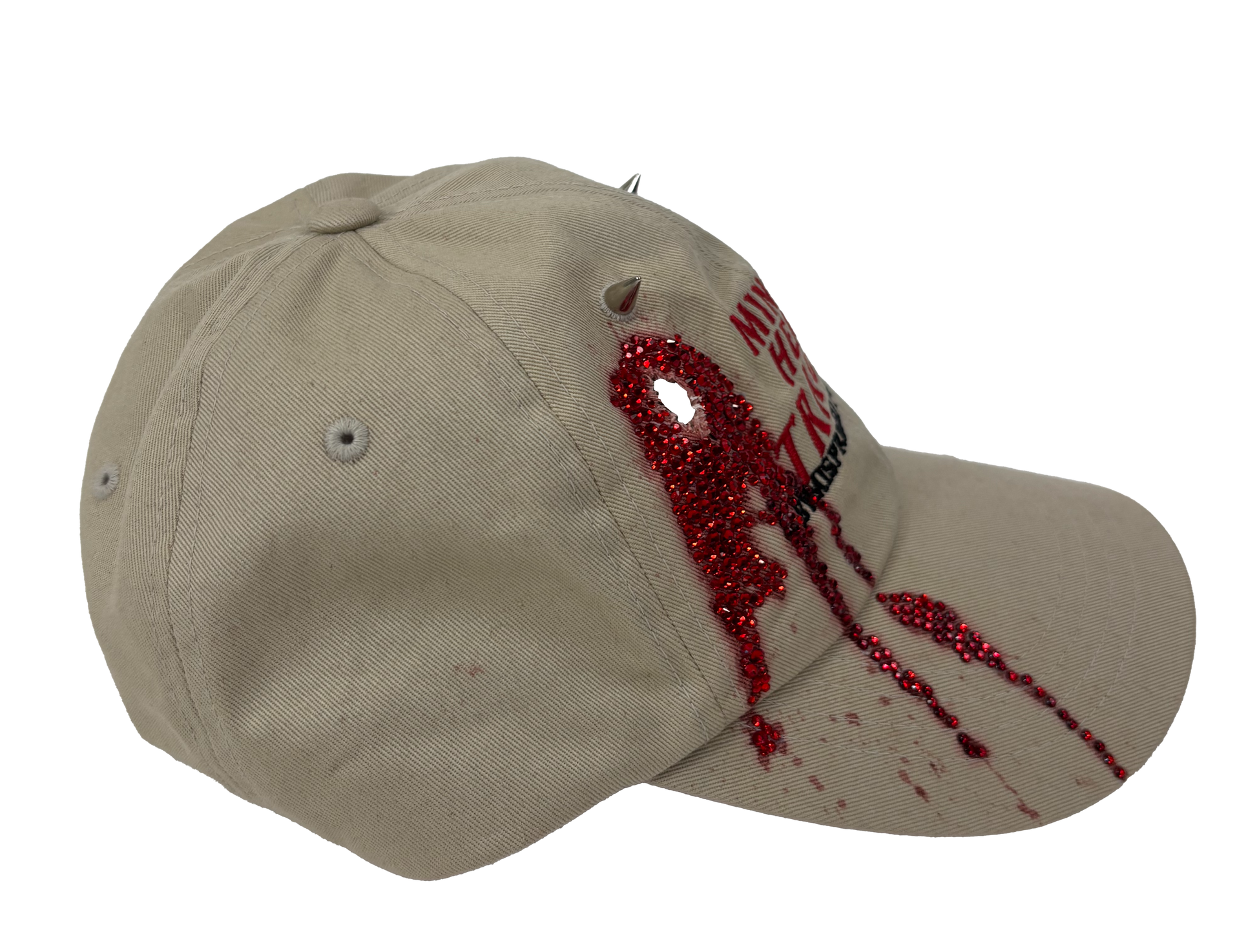 Tan-colored hat with embroidered design, red stones, custom details and spikes